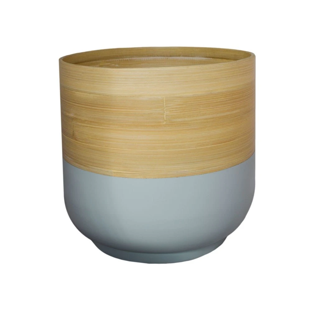 Handmade light and sturdy bamboo pot with a natural and light blue finish. Supplied without drainage holes for use as an indoor pot cover. Available in a choice of sizes.